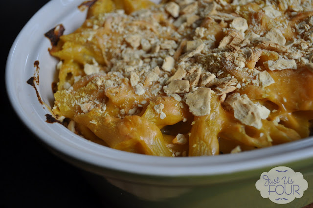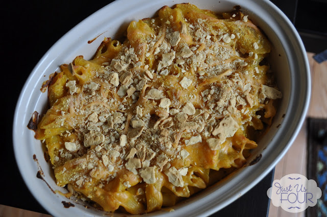 I mixed the pasta with my pumpkin sauce and poured it into my baker. ย I topped it with a bit more cheese and my crushed flatbread before putting it into the oven to finish. ย It smelled so delicious when it was baking.