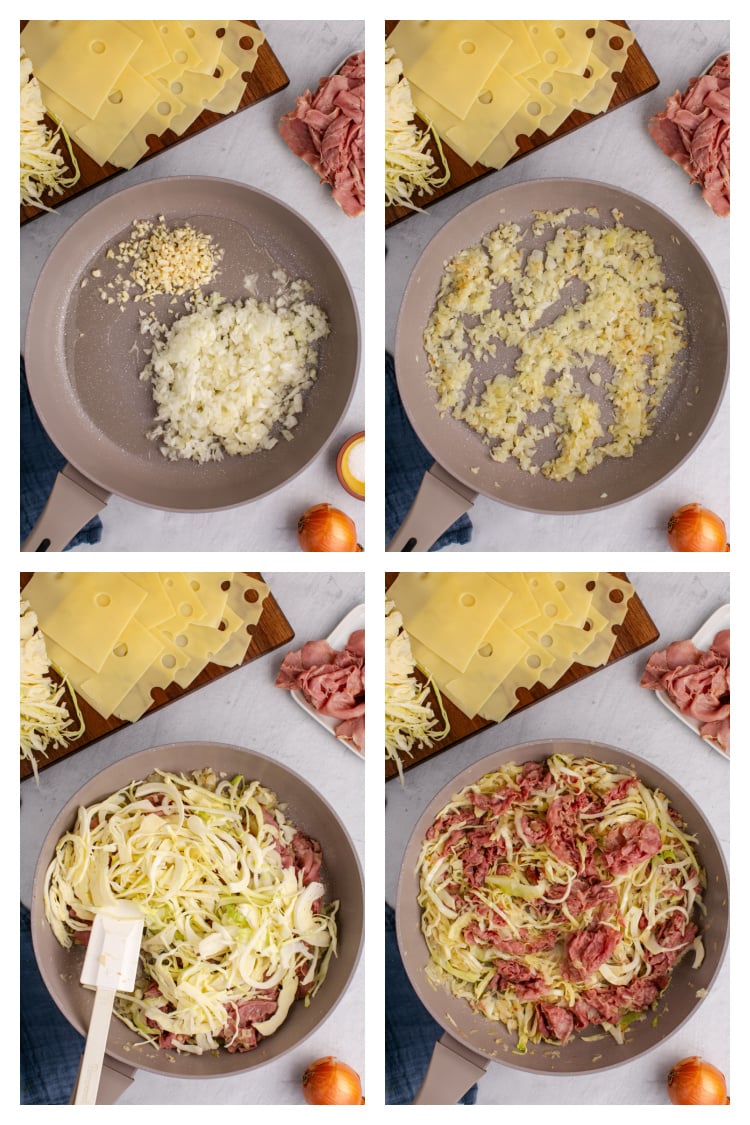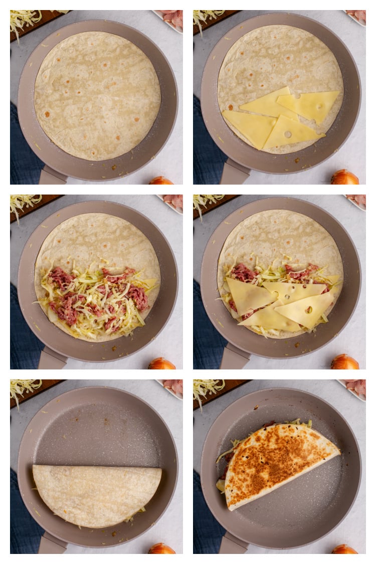 - Temporarily remove the pan from heat, and place 1 tortilla in the pan. On half of the tortilla, put 2 of the cheese slices (I cut them to cover more area), ½ of the corned beef and cabbage mixture and 2 more slices of cheese, then fold over the other side and place of medium heat until golden brown. Flip and brown the other side.2 10" flour tortillas, 8 Swiss cheese slices or 2 cups shredded
