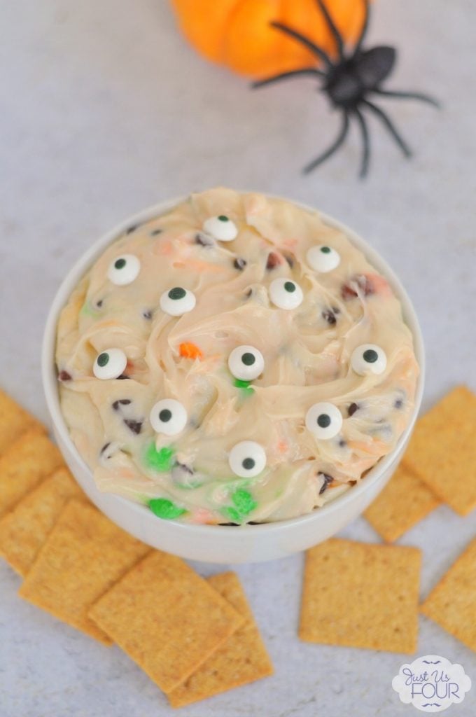 - Beat together the cream cheese and powdered sugar until smooth. Slowly add in the cooled butter mixture letting each addition fully incorporate before adding more. Let the mixer run for about 1 minutes. Fold in the mini chocolate chips, mini M&Ms and 1/2 of the candy monster eyes. Transfer to bowl and refrigerate for 1 hour. Before serving, add remaining monster eyes to the top of the dip.