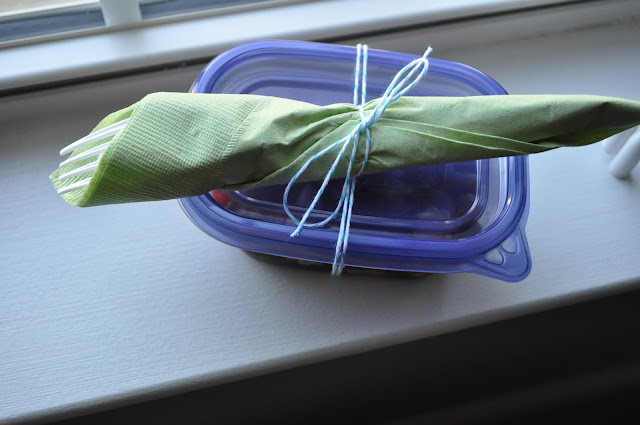 The bean salad was served in little individual containers with the spoons tied to the top I did the same with the quinoa salad but forgot to take a picture.