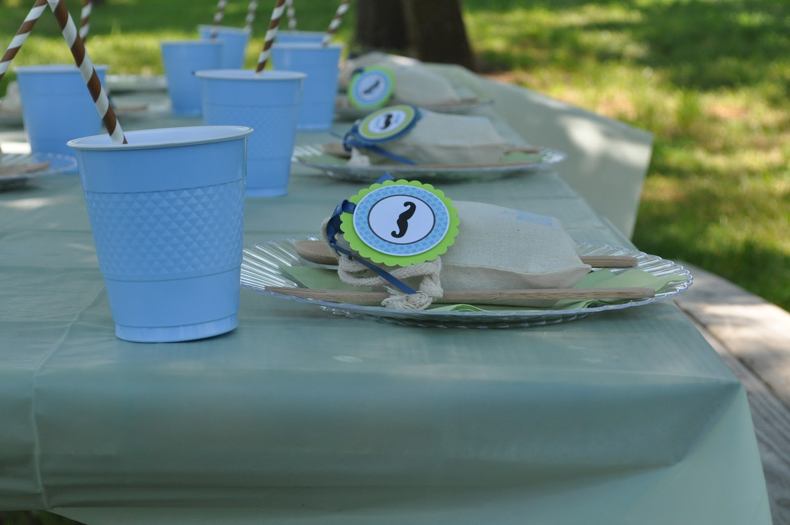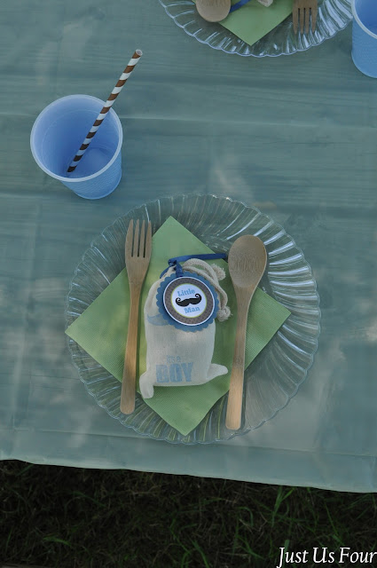 I used the nearby picnic table for seating. I covered it with another green table cloth and then put out place settings that included these really cute bamboo utensils