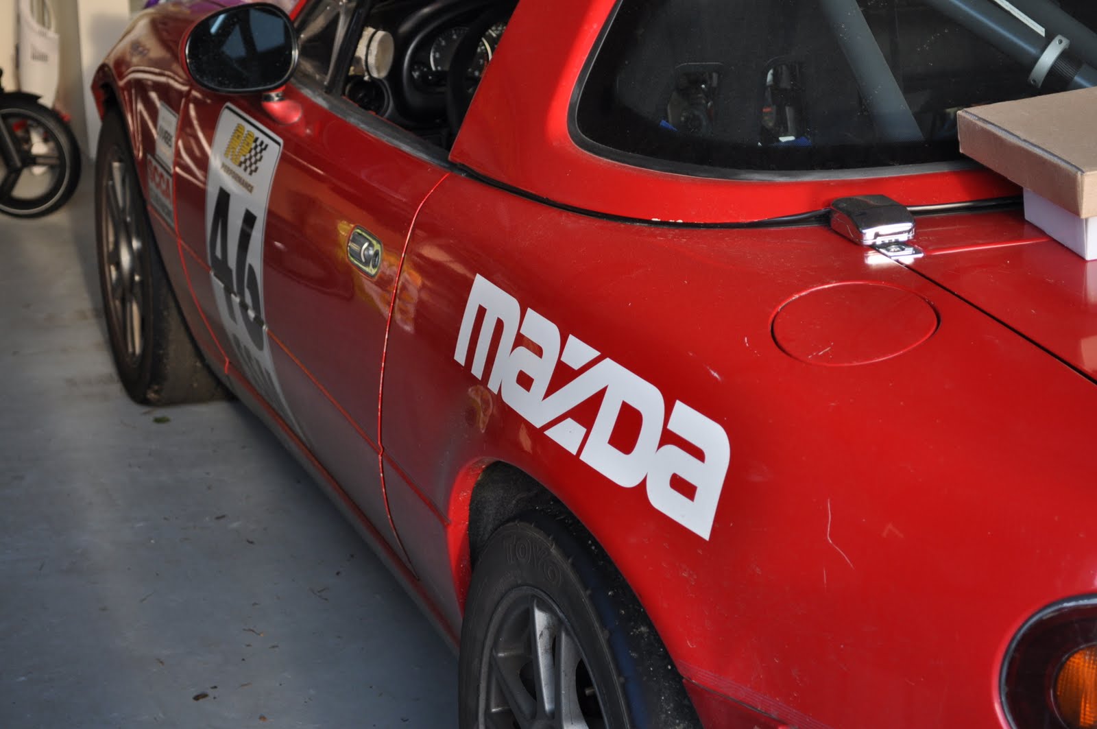 Youโve learned a little bit about what my hobbies are by now (cooking, wine, organization, working on decorating our home, etc.). That little car is hubbyโs hobby. From that picture, it probably looks like any regular Miata that you would see on the street but it really isnโt. The inside โluxuryโ items are gone and have been replaced by racing gear. He doesnโt get to do it as often as heโd like but Hubby uses it to run in road races at a semi-local race track. He participates often enough, though, that it only makes sense for us to have a vehicle that can easily haul people AND haul the car.