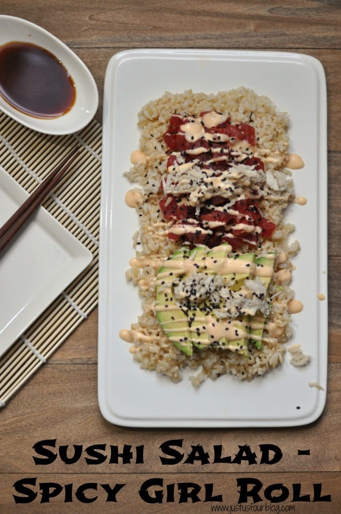 I am a total sushi addict. I try to get it at least once per week and would probably eat it almost every day if I could. One thing I am not quite ready to try though is rolling my own sushi. Seriously, the thought of that totally scares me. I know I don’t have the patience and would get frustrated with trying to learn. So, instead, I decided to take all of the flavors of my favorite roll (spicy girl roll) and make a sushi salad.