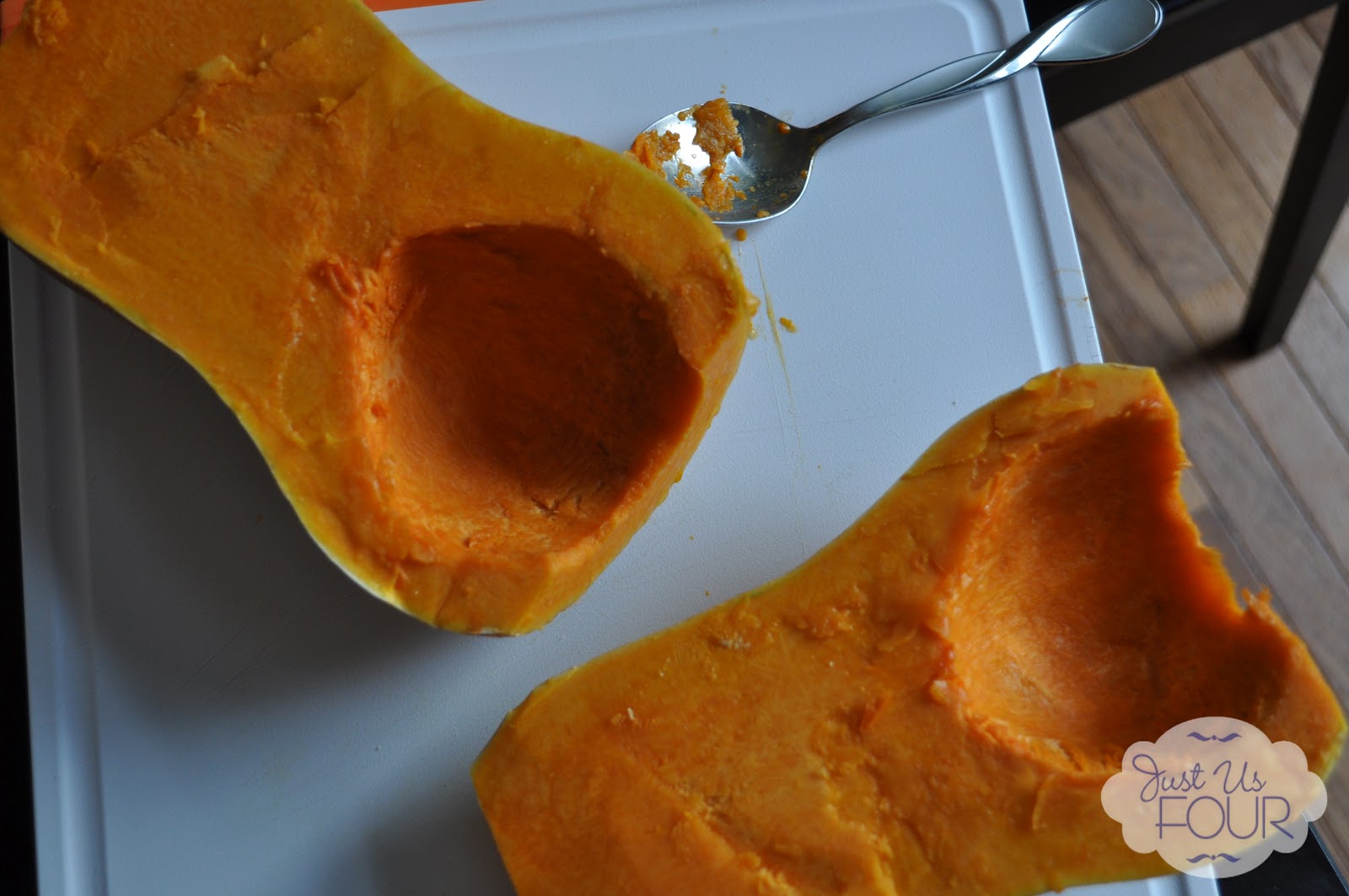 - Place your butternut squash in the microwave and cook for 5 minutes to soften. Cut in half, scoop out and discard the seeds.